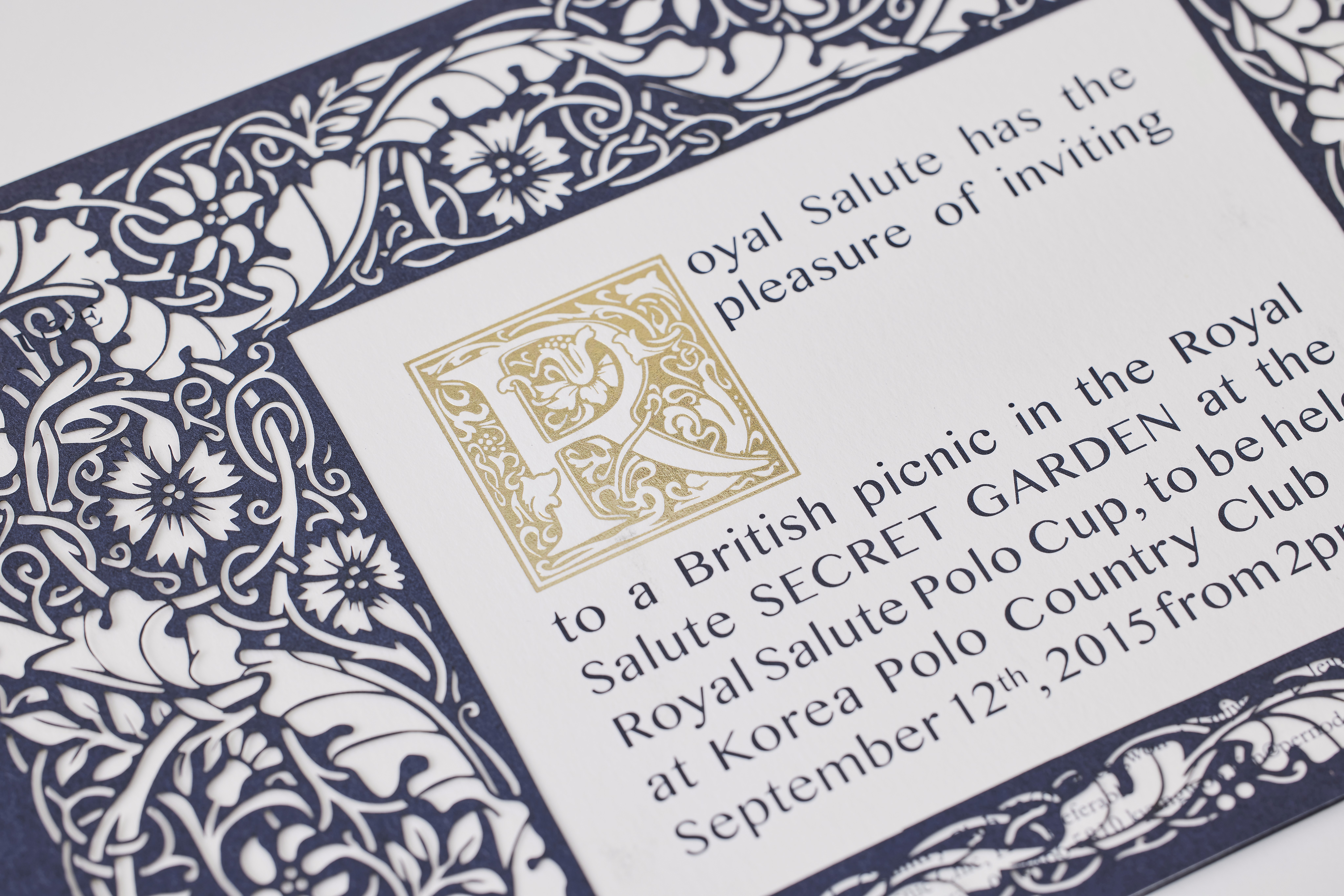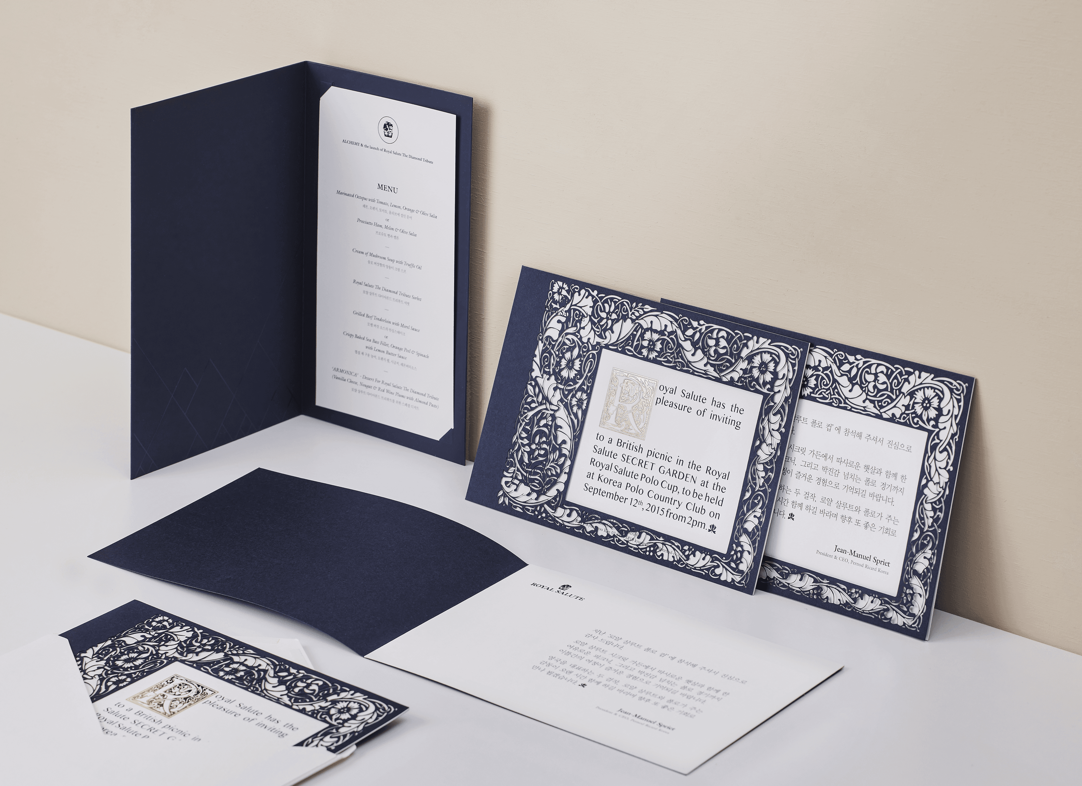 로얄살루트 시크릿 가든 초대장은 브랜드가 지닌 헤리티지와 품격을 시각적으로 확장한 초청장 프로젝트입니다. ‘시크릿 가든’이라는 콘셉트를 중심으로, 로열 살루트가 지닌 깊이 있는 역사와 절제된 럭셔리를 섬세한 패턴 언어로 재해석했습니다. 자연의 유기적인 곡선과 클래식한 장식 요소를 결합한 패턴은 은밀하면서도 품격 있는 분위기를 연출하며, 브랜드 고유의 아이덴티티를 시각적으로 상징화합니다. 패턴은 단순한 장식이 아닌, 브랜드가 지닌 시간성과 장인정신을 은유적으로 드러내는 장치로 작동합니다. 표지는 깊고 안정적인 톤의 디프 매트 인디고 용지를 사용해 묵직한 존재감을 강조했으며, 내지는 올드밀 종이를 적용해 자연스러운 질감과 클래식한 감성을 더했습니다. 각 종이는 로열 살루트의 프리미엄 가치와 조화를 이루도록 신중하게 선택되었으며, 촉각적인 경험을 통해 브랜드의 깊이를 전달합니다. 본 프로젝트는 콘셉트 기획부터 패턴 디자인, 인쇄 사양 설계에 이르기까지 전반적인 아트 디렉션을 통해 완성되었으며, 브랜드가 지닌 헤리티지와 품격을 하나의 인비테이션 오브제로 구현했습니다.